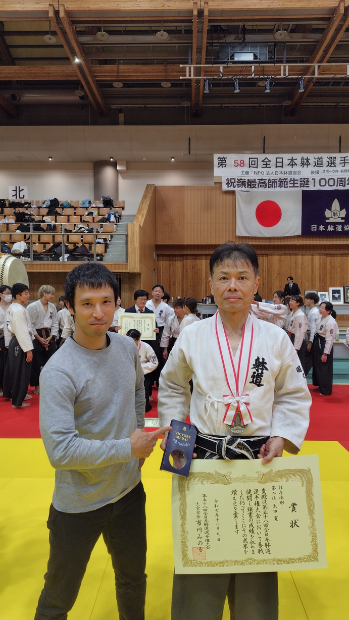 新年最初の大会、範士等大会です。 全国の4段以上の先生方が集まり、演武として法形や創作攻防等を披露しました。 翔鷹会から堀米が出場し、旋陰の法形にて優秀賞を頂きました。 同じ多摩地区の東村山道場の金子先生も出場し、変陰の法形で同じく優秀賞を獲得されました。 多摩地区から二名優秀賞となり、多摩地区のレベルの高さを見せられたかと思います。 今年は、翔鷹会としても多摩地区全体としても、飛躍していきたいです! | |
